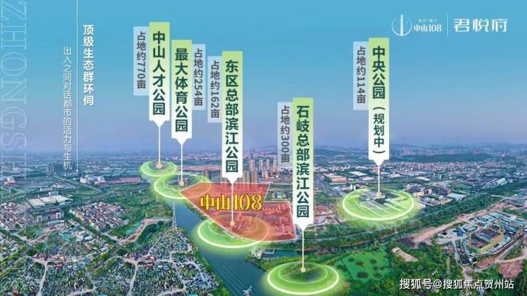 :总占地面积约 258,064 平方米,住宅用地 101 亩,总建筑面积约 120 万平方米,其中住宅组团 “中山 108 君悦府” 建筑面积约 23 万平方米