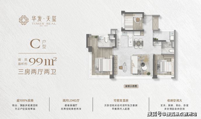 约99㎡3+1房两厅两卫:约35㎡LDKB厅餐客一体化设计,可变双套房;270°无遮挡视野,室内空间通透