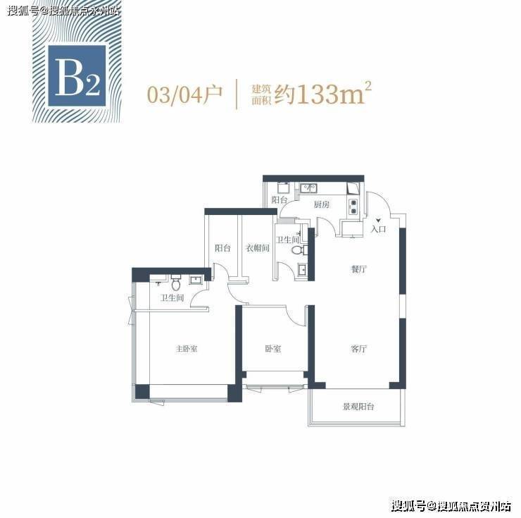 B2户型约133㎡2+1房两卫(1栋2单元03/04户型)经典竖厅格局,餐客一体设计,需要靠封阳台获取+1房,西南朝向,看向在建的赤湾朗玥佳园,能看到伶仃洋海景。