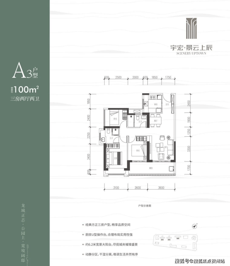100㎡的3房2厅2卫,设计的是竖厅格局,客厅3.6米开间,LDKB一体化,三开间朝南,3个卧室分别做到了3.1米/2.6米/2.4米的宽度,客厅连接次卧出6.2米长的大阳台,U型厨房,卫生间干湿分离,得房率约76%(不含赠送),东南朝向。