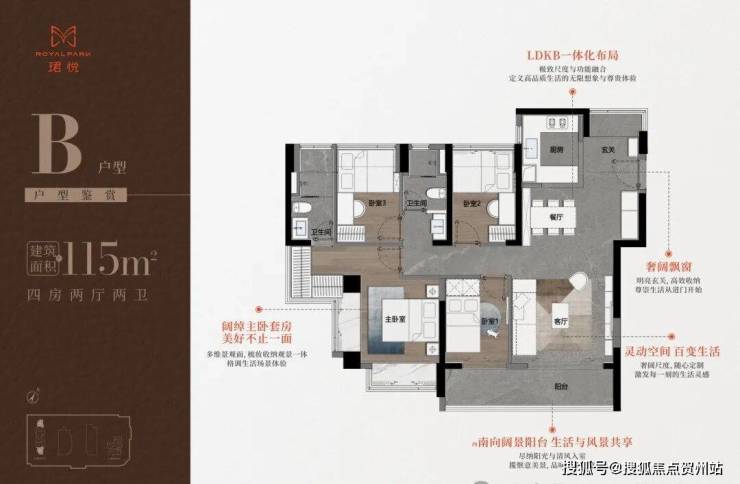 (2)115㎡四房:南北通透或全南向布局,配备6.2米巨幕阳台,主卧双飘窗,次卧尺度较小。