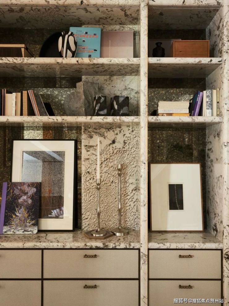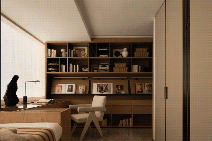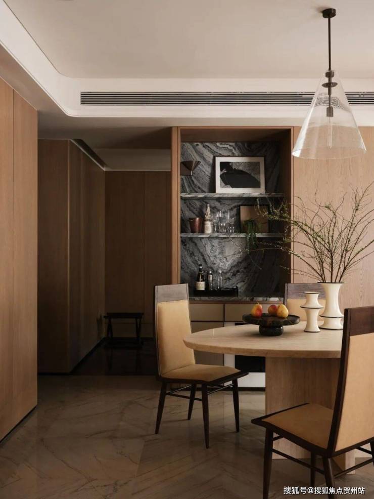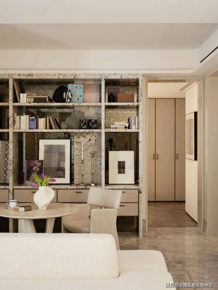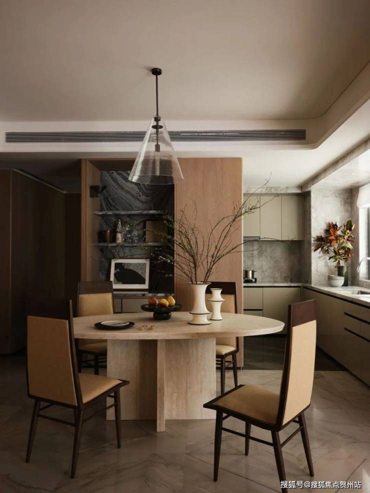 客厅通过设计包容空间情绪的诞生,和谐、温润、柔软。为了空间叙事的一致性,墙身竖向采用圆弧的设计手法,通过局部玉石的点缀构成精致优雅的第一感受。双面沙发置于客厅中央,一面作为会客厅,一面通过圆桌组合形成多功能X空间,扩展空间的功能使用界限。