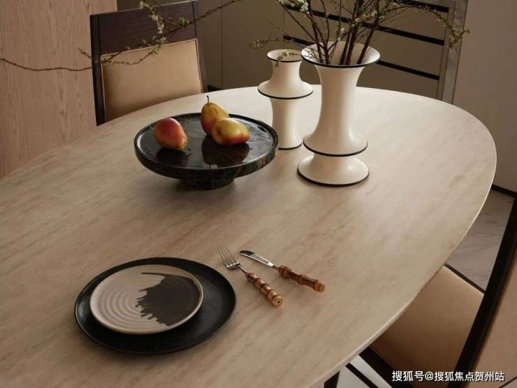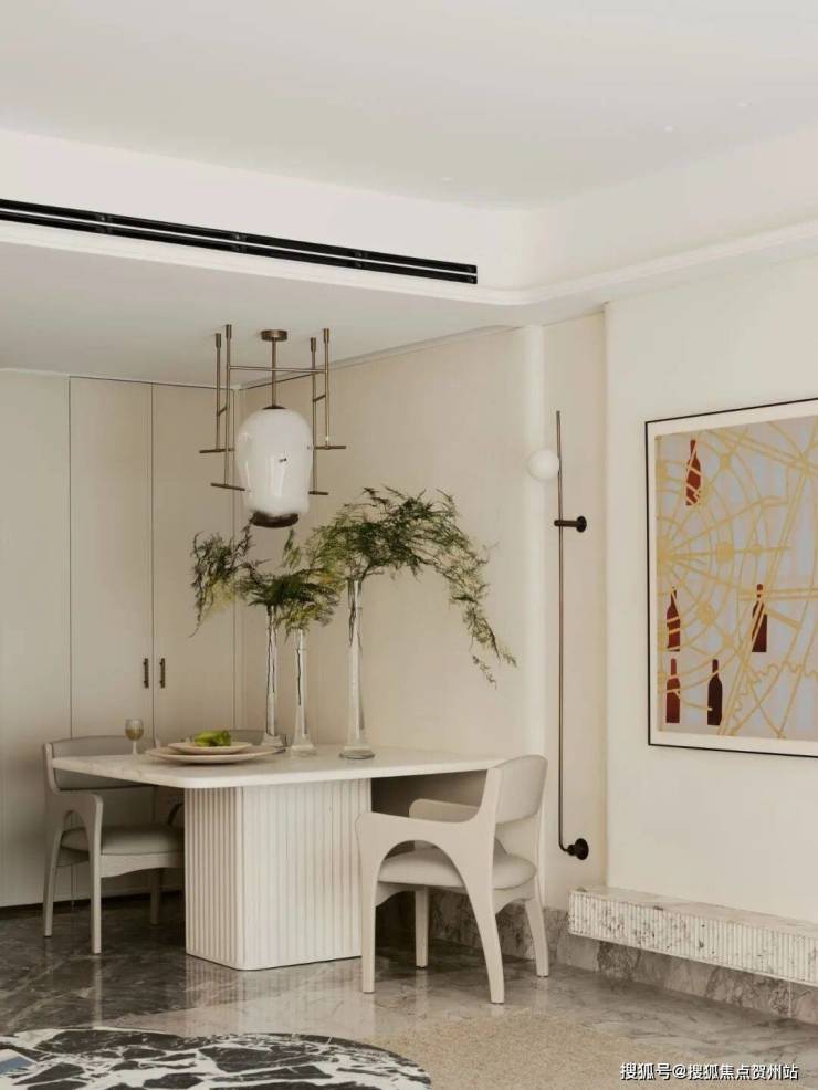 餐厅是洄游动线的「中转站」,容纳各个空间区域情绪的起承转合。一切舒适的感受来自设计在细微之处的思考和设置,有如散落光线的玻璃吊灯、触感温润的石材餐桌、竹节形态的白色花器,种种不同组成空间的和谐乐章。