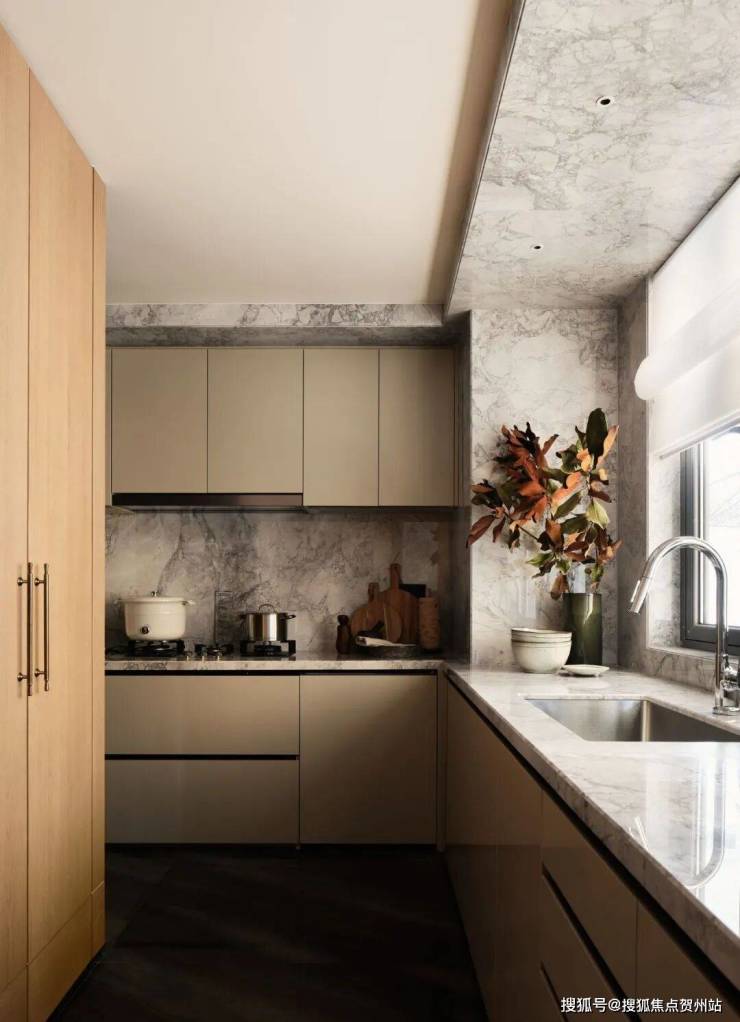 入户玄关与客厅、餐厅、厨房联动,将各个空间的生活动线和收纳动线汇总在一条通道之上,有效释放了过渡空间的尺度。设计将原有的封闭式厨房更改为U字形厨房,岛台成为链接客厅与厨房的功能区域,让家庭之间的互动更为通畅。
