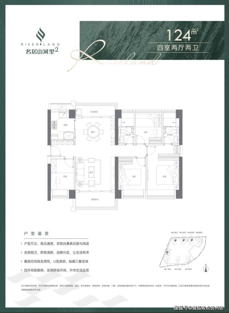 124㎡的4房2厅2卫,设计的是竖厅格局,客厅3.8米开间,南北通透双阳台,四开间朝南,全屋飘窗,U型厨房,得房率:73.86%(不含赠送),阳台1.5米进深,主朝东南向。