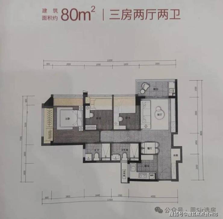 80㎡的3房2厅2卫,设计的是竖厅格局,客厅3.3米开间,LDKB一体化,S墙设计预留冰箱卡槽位,3个卧室分别做到了3.65米/2.55米/2.45米的宽度,L型厨房,卫生间干湿分离,有朝东北向或正东朝向。