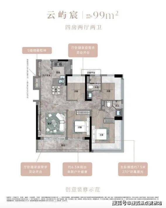 99㎡的4房2厅2卫,设计的是竖厅格局,客厅3.35米开间,LDKB一体化,S墙设计预留双开门冰箱卡槽位,三开间朝南,动静分区,分别做到了主卧15.26㎡/次卧9.57㎡/次卧6.96m²/次卧6.96㎡(包含墙体飘窗),U型厨房,公卫三段式干湿分离,赠送设备平台,得房率约78.27%(不含赠送),客厅连接次卧出9.37m²大阳台西南或东南朝向。靓点:99平做到了4房2卫,主卧270°无柱转角飘窗,厨房烟道外置+额外赠送设备平台,并且是纯南向格局。