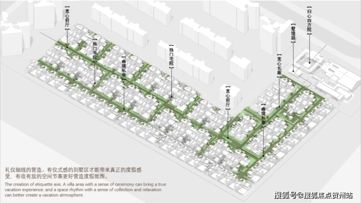 基于这样的自然优势,万科不是简单地将院子排布在水系旁,而是将院子设计成一个个簇拥在一起的“岛屿”,如同一个个岛屿环抱“水系”一样,有着环水岛居的意境。