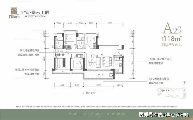 118㎡的4房2厅2卫,设计的是横厅南北通透格局,客餐厅6.2米开间,LDKB一体化,五开间朝南,西北面5.4米长的观景大飘窗,4个卧室分别做到了3.3米/2.7米/2.7米/2.3米的宽度,客厅连接餐厅位出6.2米长的大阳台,L型厨房,卫生间干湿分离,得房率约76%(不含赠送),东南朝向。