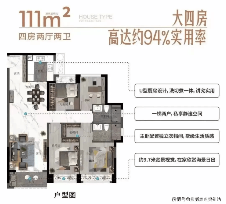 建面约111㎡四房两厅两卫一梯两户,出入电梯不排队,更享私密居住体验约9.7米宽海景视觉,享270°阳台景观视角,让窗外的风景成为家中装饰超94%实用率,阔绰四房一步到位U型设计宽敞厨房,装得下双开门主卧配备独立衣帽间,生活总要有点仪式感