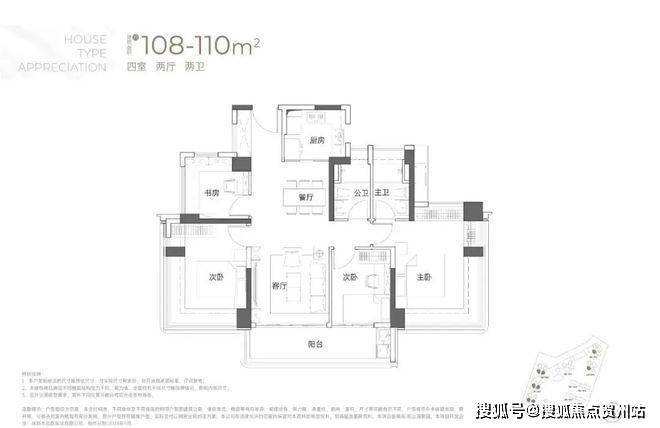 竖庭格局,西南向,基本居住功能与建面约108-110㎡4房2卫一致,但格局不一样,从目前公布的户型图上看,主要是主卧空间有了更大的提升,比如可以放更大一点的衣柜。