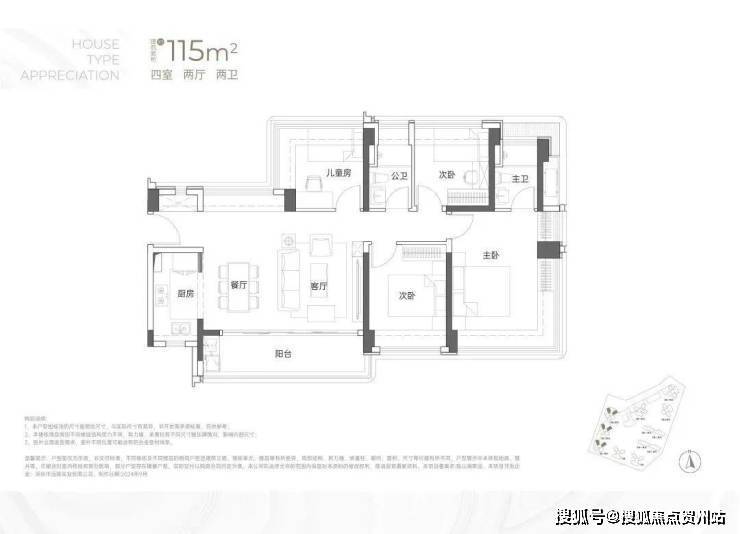 竖庭格局,西南向,基本居住功能与建面约108-110㎡4房2卫一致,但格局不一样,从目前公布的户型图上看,主要是主卧空间有了更大的提升,比如可以放更大一点的衣柜。但从位置上看,它所在的楼栋更靠近主干道,会有噪音影响。建面约115㎡4房2卫