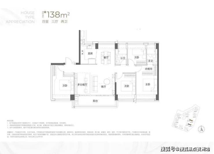 东南或西南朝向以及西北朝向,有3种户型格局,但整体差异并不大,都是横厅设计,阳台也都非常宽敞。主要核心区别是阳台的设计,这应该是为了贴合楼栋朝向、景观所做的调整。建面约138㎡4房2卫