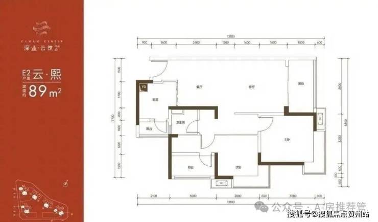 89㎡的3房2厅1卫,E3户型,仅4栋/5栋A单元/7栋的03号房才有,设计的是竖厅格局,客厅3.6米开间,LDKB一体化设计,3个卧室分别做到了3.2米/3米/2.8米的宽度,二字型厨房还带1个小生活阳台,卫生间三段式分离,得房率:79.89%(不含赠送),阳台都是西南朝向。