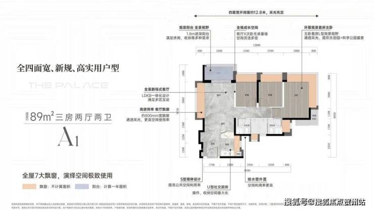 以89㎡A1户型为例,客厅270度采光,无主厅化设计,凸窗80cm深,空间灵活。玄关S型冰箱位,优化厨房空间。主卧270度凸窗,视野开阔。卫生间上下水管外置,节省空间且美观。