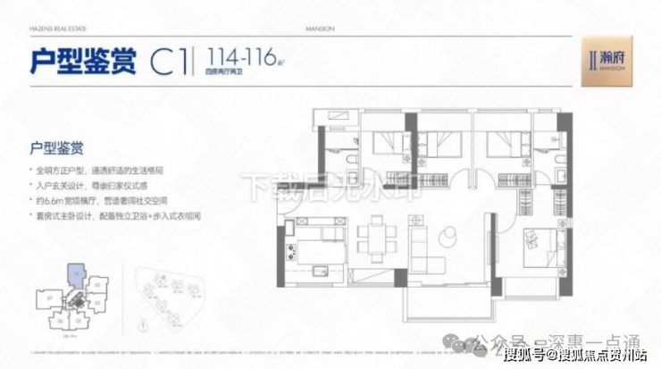 114㎡的4房2厅2卫,C1户型,设计的是横厅南北通透格局,客餐厅6.6米开间,LDKB一体化设计,四开间朝南,全屋7面飘窗,主卧套房+步入式衣帽间,3个次卧朝西北向,得房率约78%(不含赠送),U型厨房,卫生间干湿分离,东南朝向。