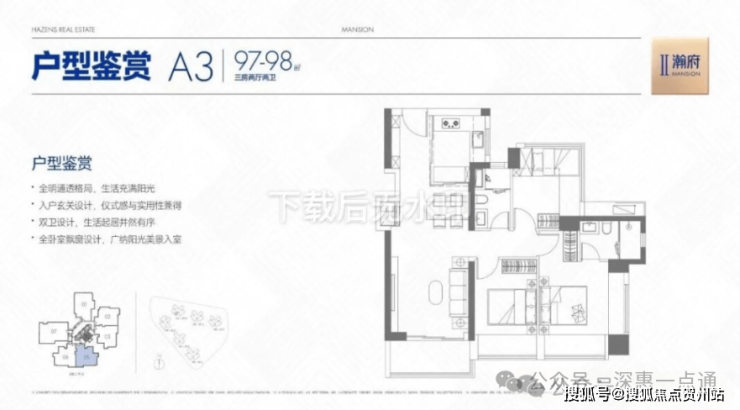 96-98㎡的3房2厅2卫,A2户型/2栋2单元03/06,设计的是经典竖厅格局,客厅3.5米开间,LDKB一体化,S墙设计预留冰箱卡槽位,动静分区,三开间朝南,主卧+1个次卧双飘窗,得房率约78%(不含赠送),U型厨房,卫生间干湿分离,西南或东南朝向。