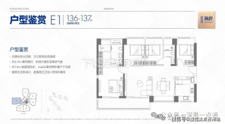 136-137㎡的4房2厅2卫,E1户型,设计的是横厅南北通透格局,客餐厅6.9米开间,LDKB一体化设计,四开间朝南,全屋7面飘窗,主卧套房+步入式衣帽间,3个次卧朝东北向,得房率约78%(不含赠送),U型厨房,公卫三段式干湿分离,客厅连接次卧出7.4米长的超大阳台,西南朝向。