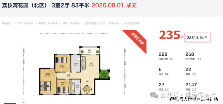 荔枝湾花园(北区)83平的单位,成交单价已经来到了2.83万/平;