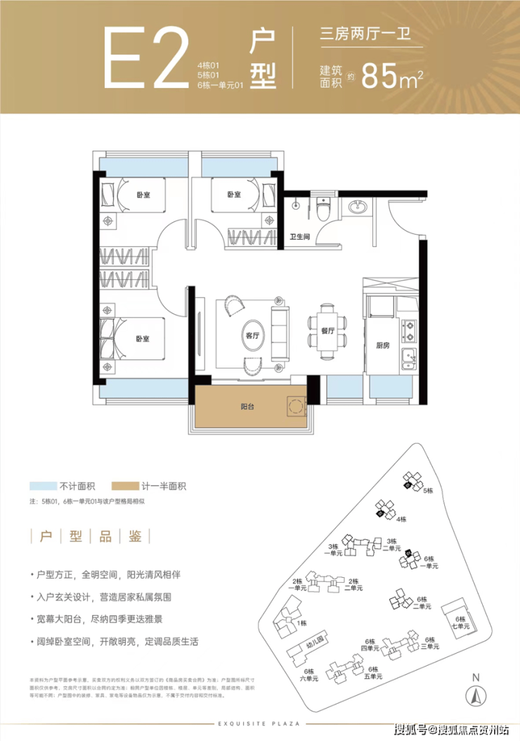 85㎡的3房2厅1卫(E2),得房率:72.95%(不含赠送),阳台主朝东南或西南向看小区园林。