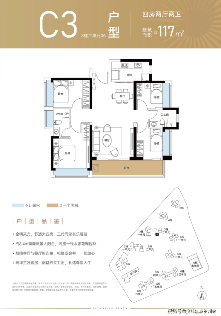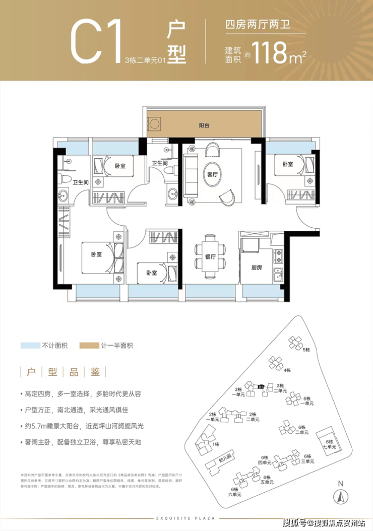118㎡的3房2厅2卫(C1),得房率:72.05%(不含赠送),约5.7米长的超大阳台,主朝北向看坪山河景观。
