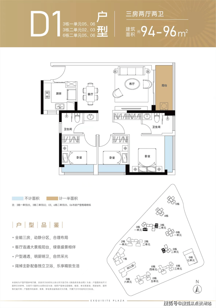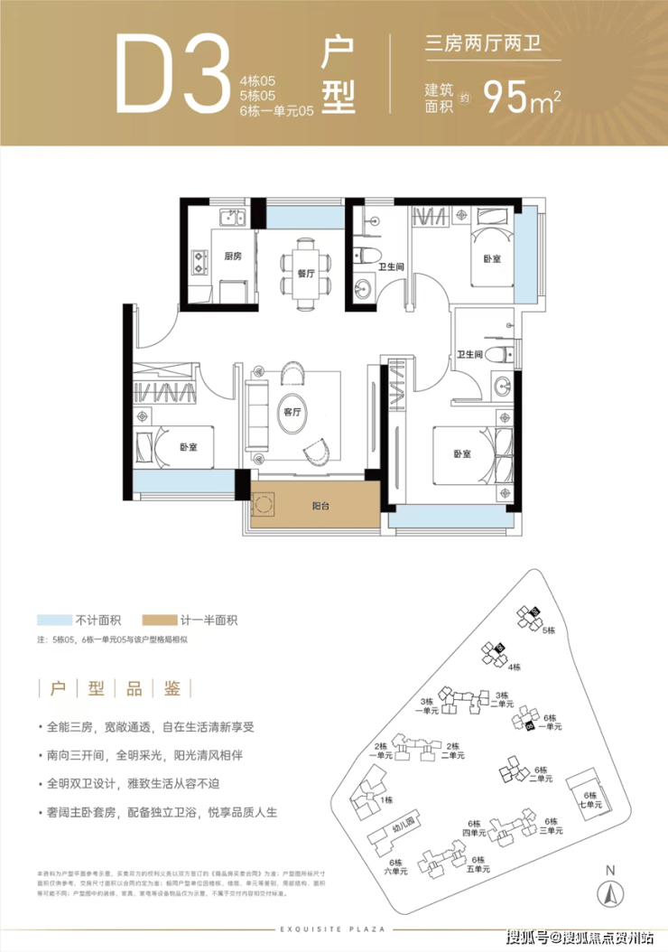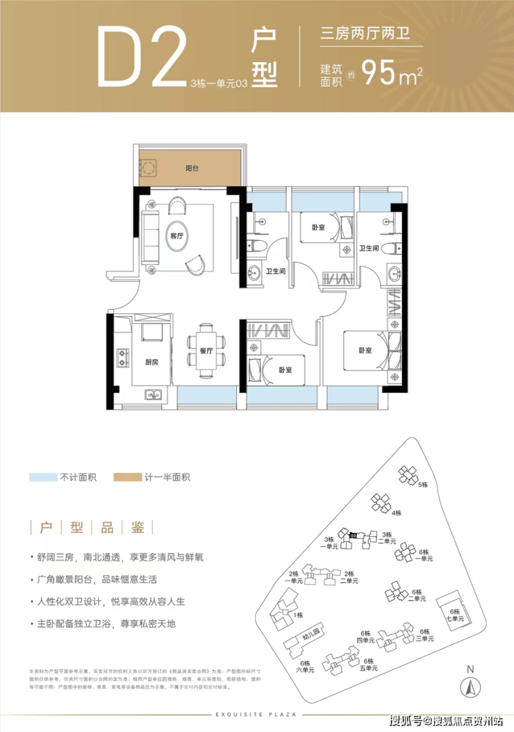 95㎡的3房2厅2卫(D3),得房率:72.95%(不含赠送),阳台主朝东南或西南朝向。