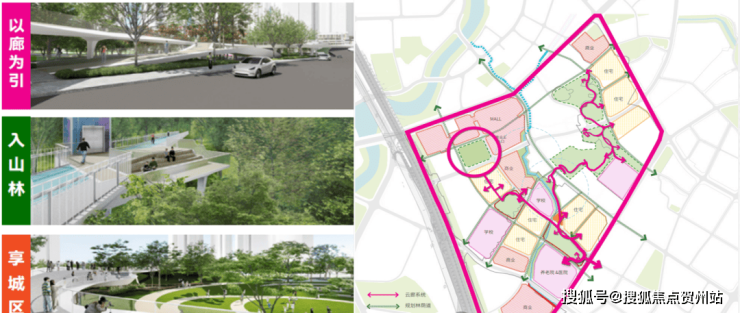 除了常规的住宅、商业、学校外,还包含文旅、医疗、公园等,另外打造特色连廊串联整个项目,高速直通地库优化交通。