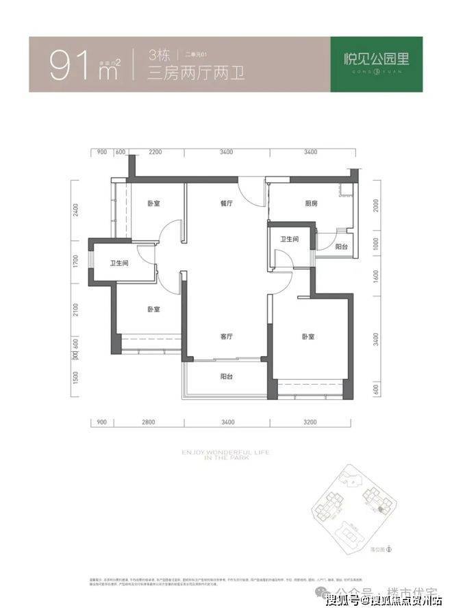 91㎡的3房2厅2卫,仅3栋2单元01户型,设计的是竖厅双龙抱珠格局,客厅3.4米开间,三开间朝南,3个卧室分别做到了主卧11.9㎡/次卧7.06㎡/次卧6.2㎡(实测面积,去掉墙体),L型厨房带1个生活阳台,卫生间干湿分离,得房率73.55%(不含赠送),西南朝向。