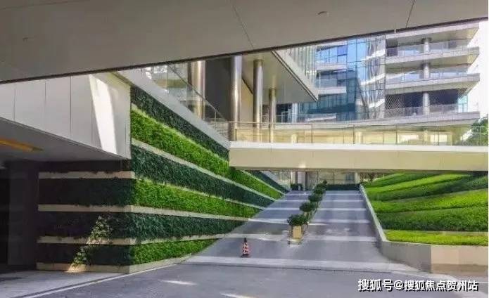 高层区地下车库入口景观,坡道空间通过设置廊架及绿化围合,形成富有层次、绿化掩映的地下车库入口景观。