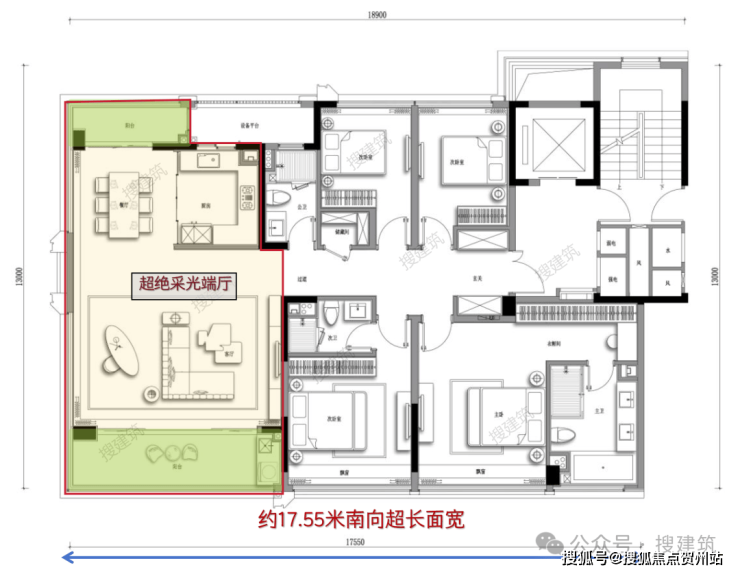 杭州湖翠云来府建面约200㎡边套的第一个重要优势,当然就是其“令人惊叹”的空间体验。南向开间自然更大,来到惊人的约17.55米,由此带来5开间朝南,并形成独特的270°转角景观,带来通透无比的三面采光。拥有了270°的IMAX超广角视野。