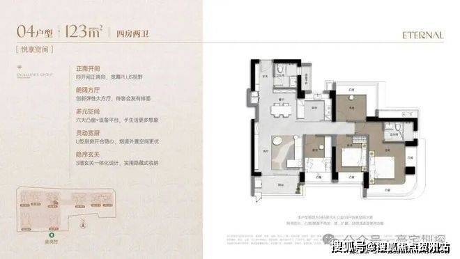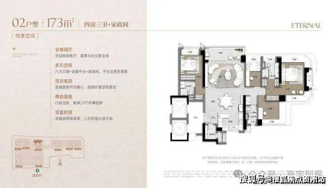 173m²的4房2厅3卫+家政间,竖厅类双龙抱珠格局,独立电梯厅入户约8.13㎡,客厅5.55米开间,LDKB一体化设计,主卧套房270°环幕凸窗+私享阳台,八大凸窗+设备平台+家政间,U型厨房,公卫三段式干湿分离。阳台正北朝向看会展中心+市民广场,得房率76%(不含赠送,套内面积131.98㎡)。