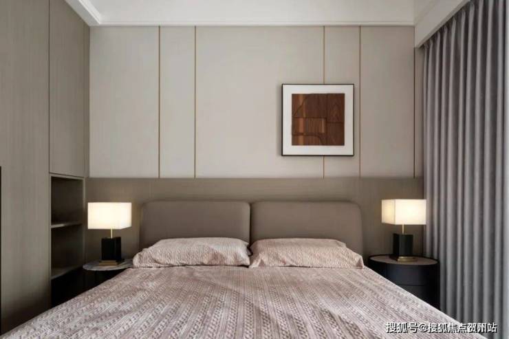 床具设计简约,浅灰色床品轻柔覆盖,床两侧台灯恰似温润美玉,散出暖暖光晕。