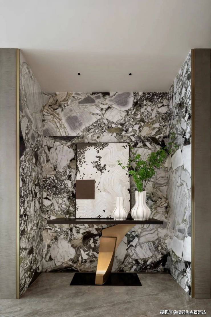 玄关处,大理石墙面宛如天然艺术画布,其纹理仿若山河沟壑,尽显自然的磅礴与细腻。艺术画以黑白交织线条诠释韵律,简约白瓶搭配鲜活绿植,刚柔融合,营造出静谧且格调十足的别墅装修氛围。