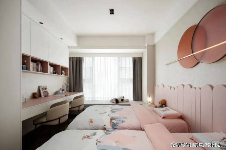 墙面以浅灰色打底,宛如轻柔云朵,为空间营造宁静氛围。床头那排粉嘟嘟的“花瓣”,好似童话中的魔法护盾,守护着甜美的梦境;上方圆形装饰仿若两颗小太阳,金属线条牵出暖光,照亮童年的奇妙幻想。