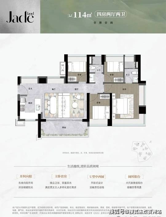 114㎡四房两厅两卫:改善顶配,独立玄关入户,客餐厅一体化布局,主卧带步入式衣帽间,部分户型享社区园林视野,精装含博世家电、全屋智能家居。