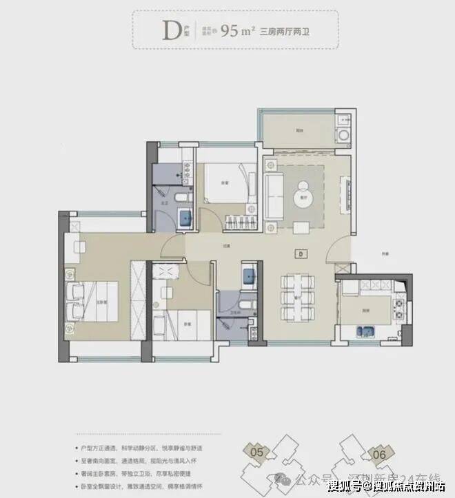 95㎡D户型三房,总价710-850万。唯一真正意义上的通透户型,客餐厅纵向分布,动静分离、干湿分离、通风性佳,缺点是其阳台在北侧,日照相对不足。值得注意的是,户型中私密性最好的主卧,同样也实现了南北通透,纵向双面开窗,大尺度观景,清风与鲜氧自由穿梭,居住品质大幅拔高。
