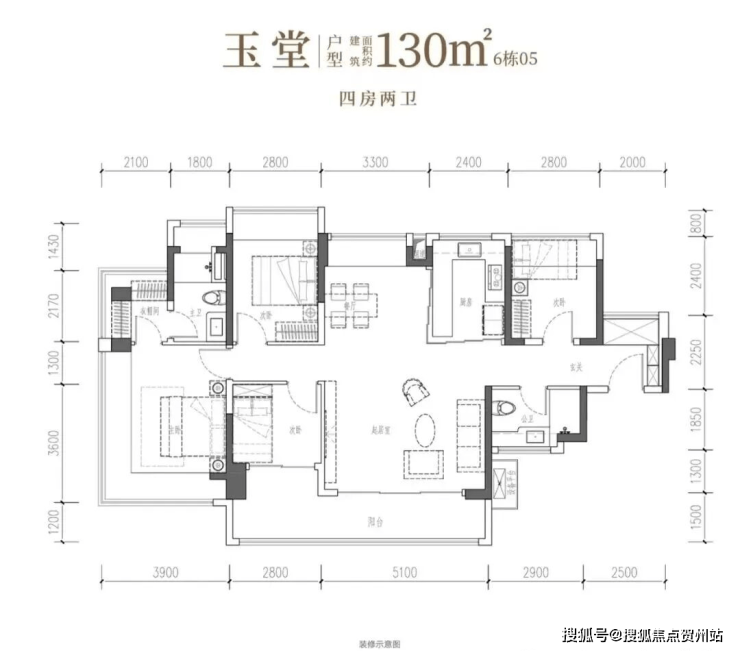 130㎡的4房2厅2卫,设计:南北通透,独立玄关,客厅5.1米宽。客餐厅分离,主卧270°飘窗+衣帽间,面积分别为23.66㎡、11.2㎡、8.96㎡、7.84㎡(含墙体飘窗)。U型厨房外置烟道,卫生间干湿分区,得房率101.95%(含赠送)。客厅连次卧大阳台14.09平,东北向。