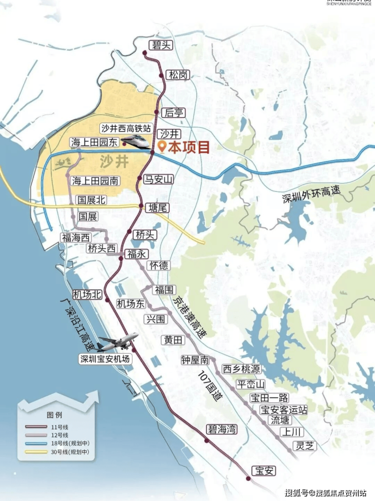 轨道交通:距离11号线“沙井站”直线约350米,步行550米,8-10分钟,6站直达宝安机场,8站宝中,9站前海