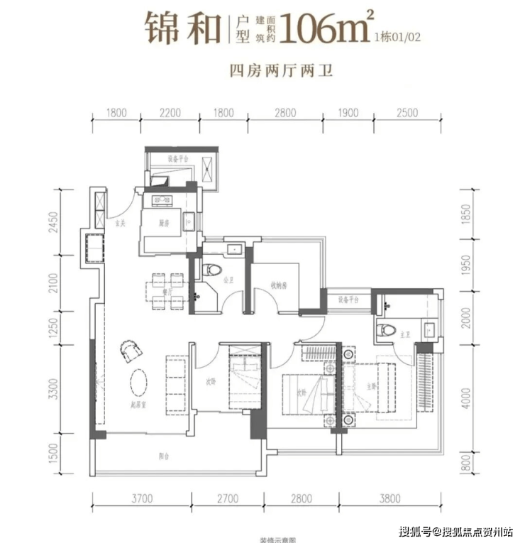 106㎡的4房2厅2卫,竖厅设计,客厅3.7米宽,LDKB一体,南向四开间,动静分区。主卧270°飘窗带1.52㎡平台,面积分别为20.34㎡、11.2㎡、7.7㎡和6.75㎡(含墙体飘窗)。U型厨房外置烟道,卫生间干湿分离,得房率101.16%(含赠送)。客厅连次卧大阳台11.76㎡,东南向。