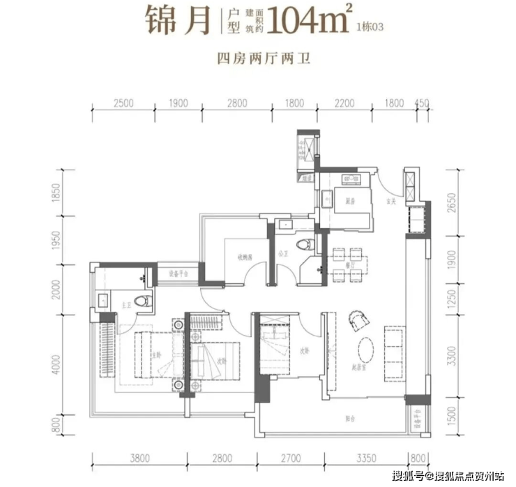 104㎡的4房2厅2卫,竖厅设计,客厅4.15米宽,LDKB布局,预留冰箱位,四房朝南。主卧270°转角窗带1.52平平台,面积分别为20.34㎡、11.2㎡、7.7㎡、6.75㎡(含墙体飘窗)。U型厨房外置烟道,卫生间干湿分区,得房率100.71%(含赠送),客厅连次卧大阳台11.23平,西南向。