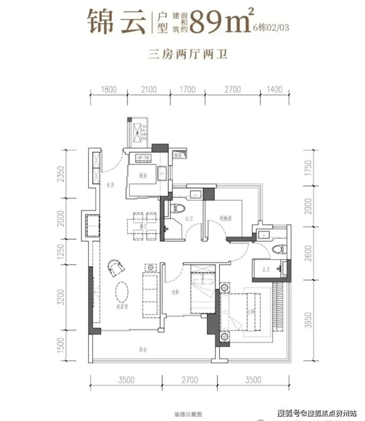 89㎡的3房2厅2卫,6栋02/03户型,经典竖厅,客厅3.5米宽,LDKB一体。S墙预留冰箱位,三室朝南,动静分区。主卧15.25㎡、次卧7.56㎡、次卧6.48㎡(含飘窗)。U型厨房外置烟道,卫生间干湿分离,得房率97.47%(含赠送)。客厅连次卧大阳台11.46平,西南/东南朝向。区别在次卧与主卫空间。