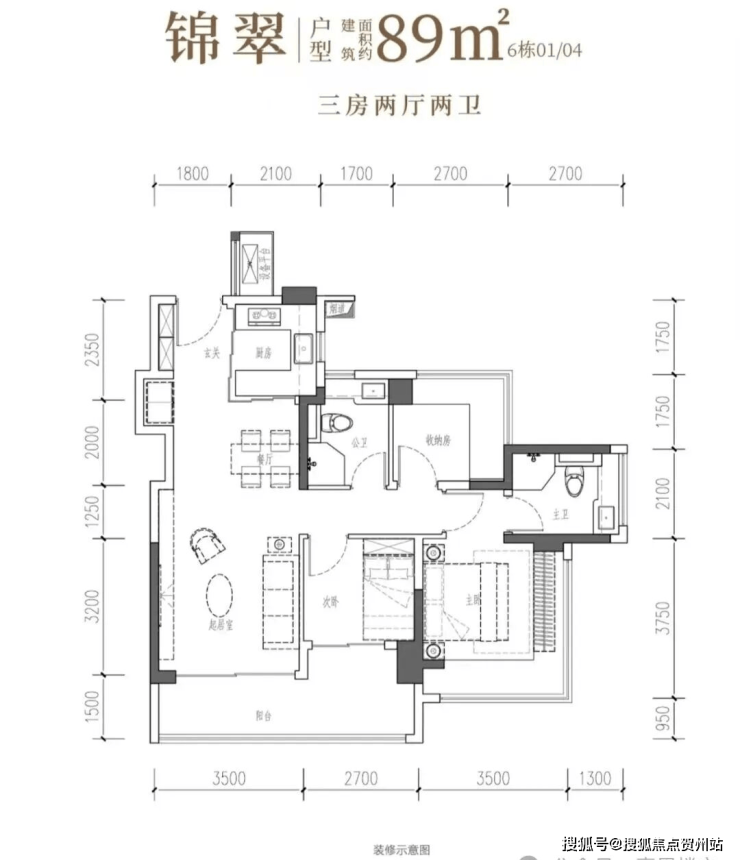 89㎡的3房2厅2卫,6栋01/04户型,经典竖厅,客厅3.5米宽,LDKB一体,S墙预留冰箱位。三开间南向,动静分区。主卧15.25㎡、次卧7.56㎡、次卧6.48㎡(含墙体飘窗),270°转角飘窗。U型厨房外置烟道,卫生间干湿分离。得房率97.47%(含赠送)。客厅连次卧大阳台11.46平,西南/东南朝向。