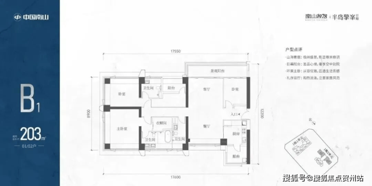 整个户型设计是四房三卫南北通透,约有7.4米大阳台。双套房设置且270°景观面,主卧带独立衣帽间和大浴缸。