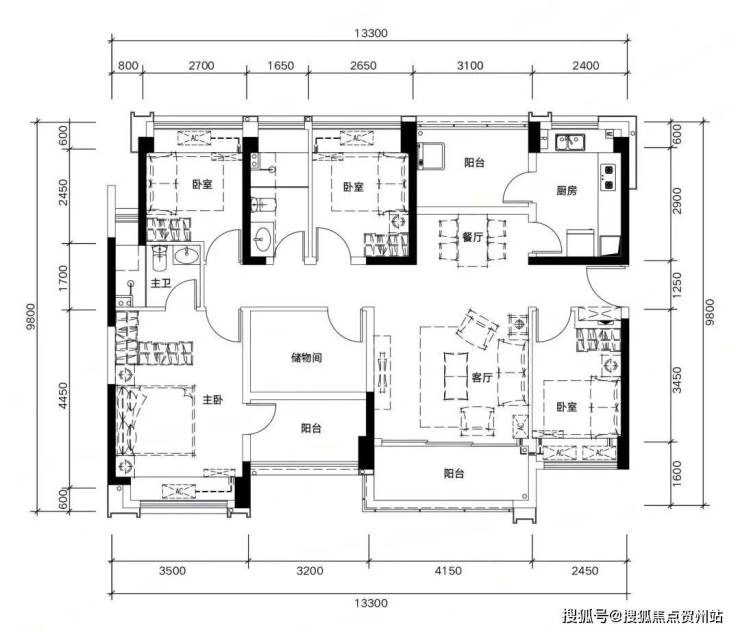 ✅ G01户型:约135㎡ 五房两厅两卫: