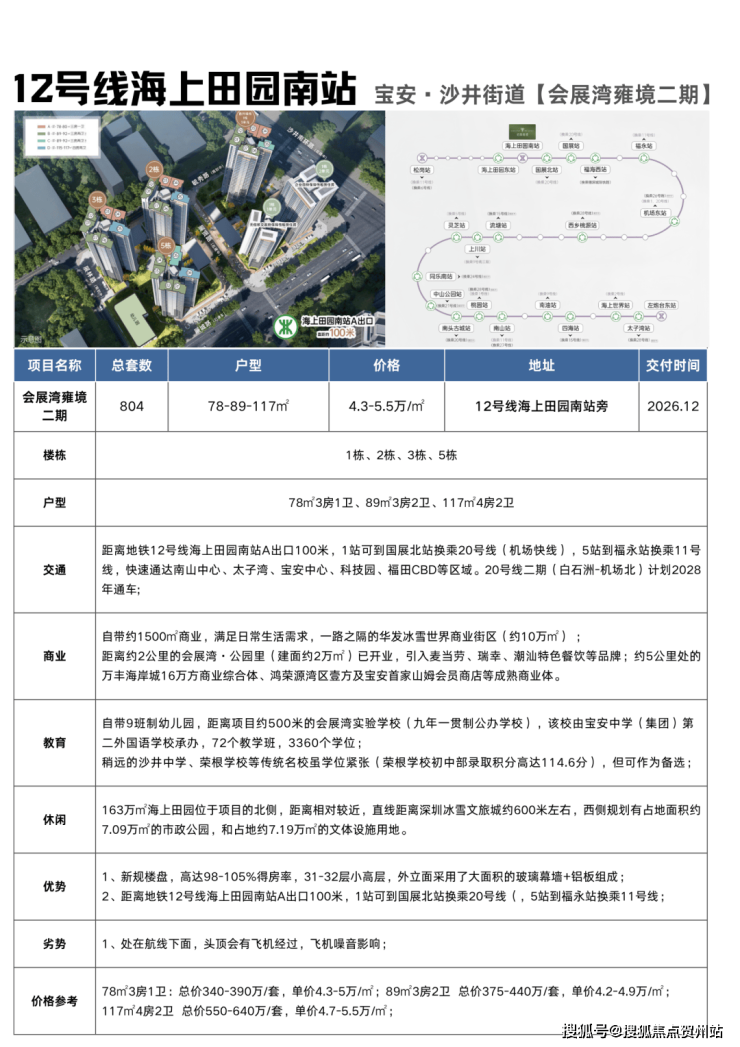 2、距离地铁12号线海上田园南站A出口100米,1站可到国展北站换乘20号线(,5站到福永站换乘11号线