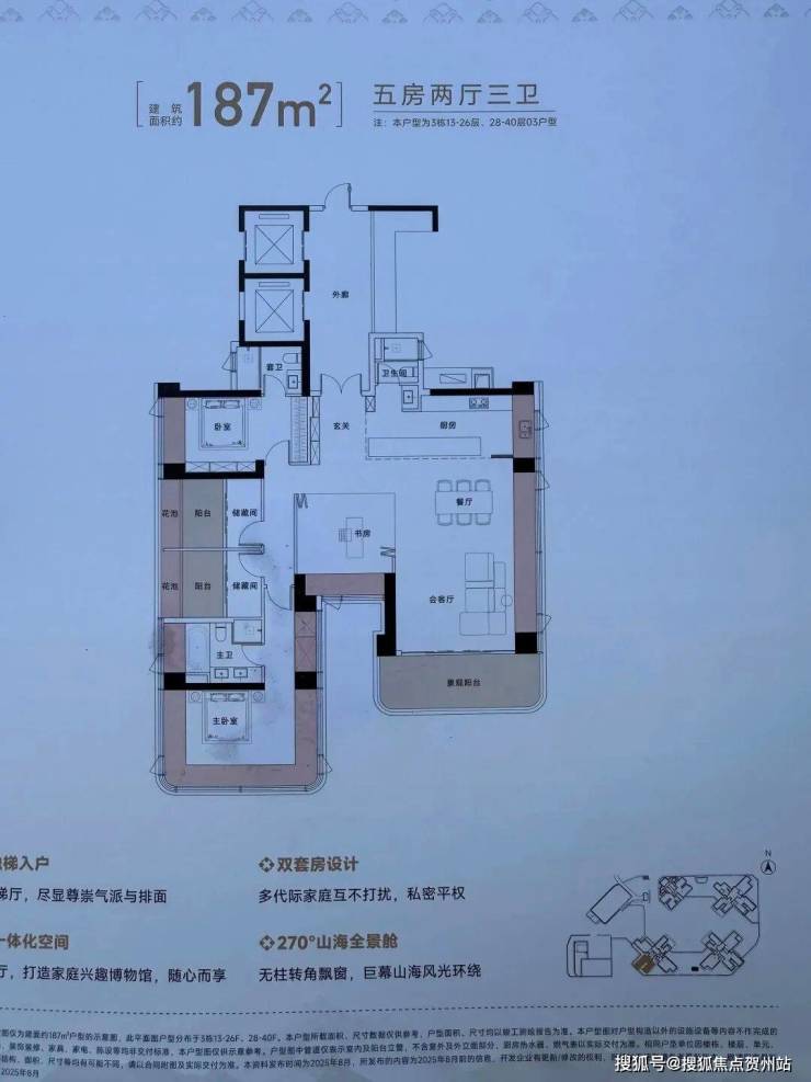 将地标高度/创新设计/极致景观/自然融合四大要素集于一体,约150米地标建筑以45°错位转体设计,实现四户分踞四角的独立瞰景布局,每户均可享有极致山海景观。约55米超宽楼间距、0.6的黄金窗墙比远超常规住宅0.3-0.5的标准,呈现山景、海景、花园三重景观界面。