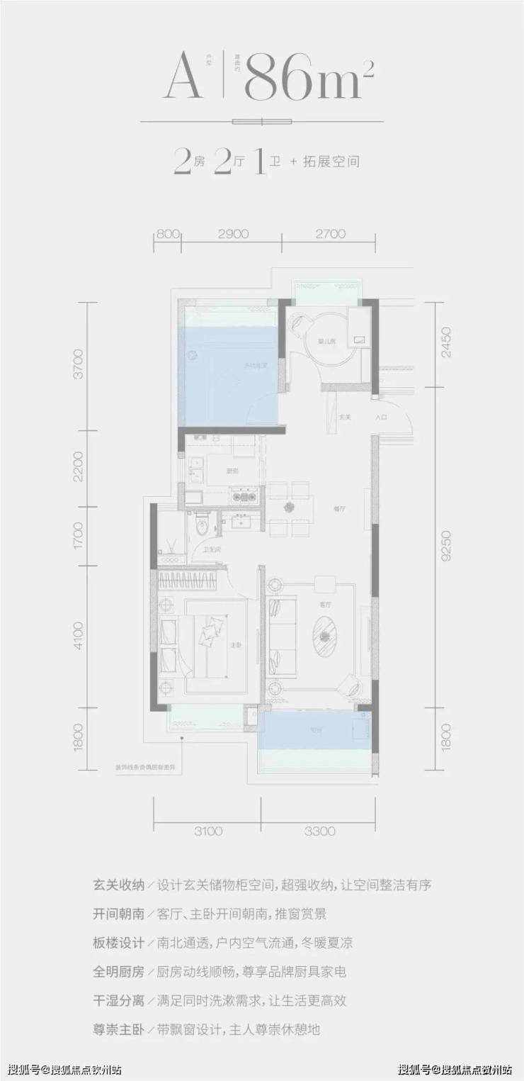 A户型——建面约86㎡2房2厅1卫+拓展空间。