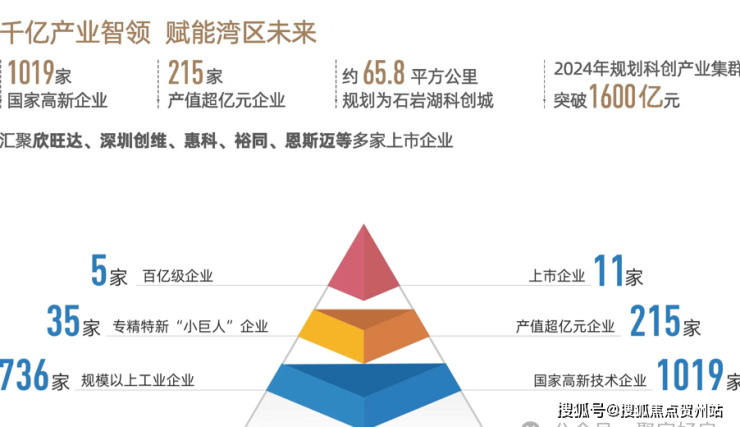 石岩科创城(规划面积65.8万平方公里)汇聚高端科技资源,驱动产业升级,形成产业集群效应,成为推动区域经济高质量发展的关键引擎。在2024年已汇集超过1019家国家高新技术企业,拥有215家产值超亿元企业,已汇聚欣旺达、深圳创维、惠科、裕同、恩斯迈等11家上市企业,规划科创产业集群突破1600亿元。