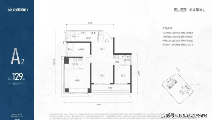 A2有两条腿,分别1-1栋03/06,主朝向是东南向,双龙抱珠格局。这个户型是超阔大阳台,朝向优于A1,但公卫是个暗卫。