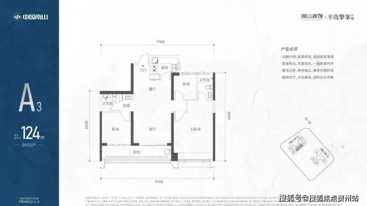 A3也是两条腿,分别是1-1栋04/05,主朝向是东南向,双龙抱珠格局。客厅拥有超大观景阳台,缺点是公卫是个暗卫,小次卧和主卫也对天井外走廊,采光不足。